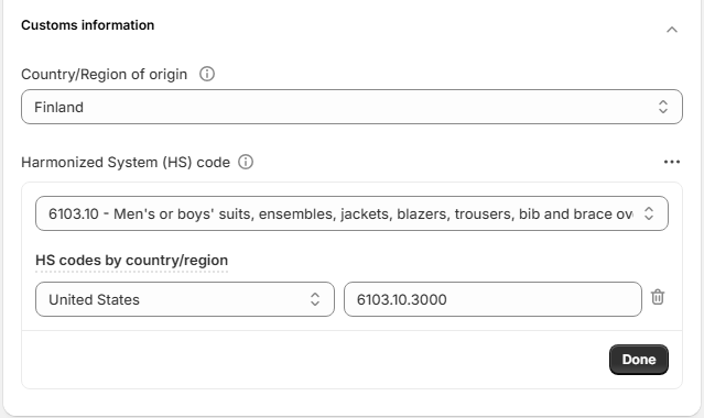 In Shopify, you can add the HS-code to the product at the Customs information section. As you can see, you can type in the six digit HS-code at the top level and then add the 10-digit version for each country. In Packrooster, the country specific HS code is used at the shipment if it is available.